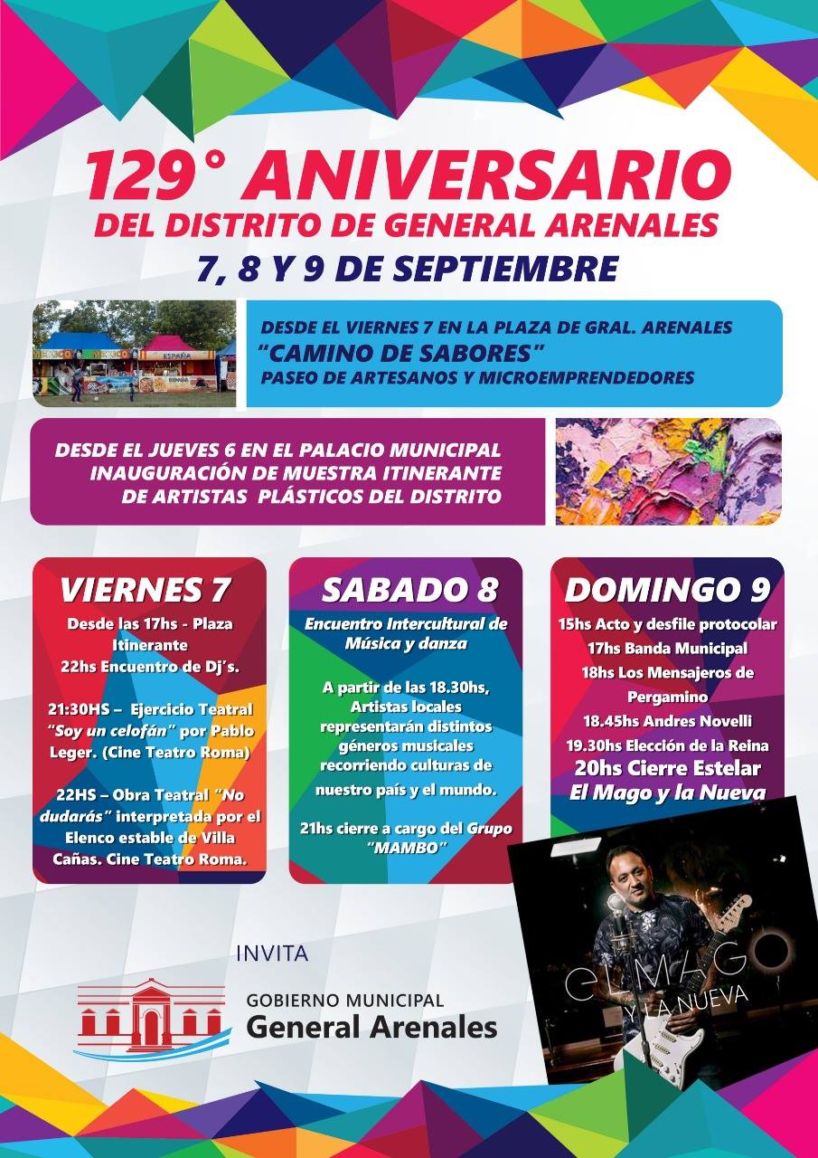 Los próximos 7, 8 y 9 de septiembre se llevarán a cabo los festejos por el 129º aniversario del distrito de General Arenales. Desde la Municipalidad difundieron el cronograma de las actvidades. Jueves 6 Inauguración de muestra itinerante de artistas plásticos locales en la Municipalidad 7, 8 y 9. Camino de sabores, paseo de artesanos … Sigue leyendo El distrito se prepara para los festejos de su 129° Aniversario